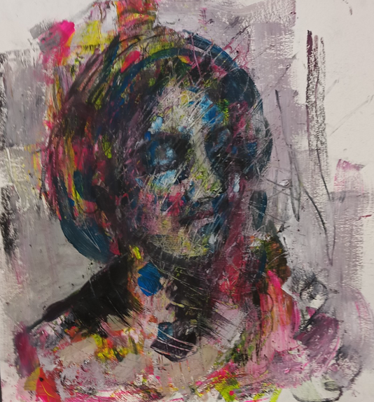 A mixed media painting inspired by Pop Art and Expressionism. It is a glitched, frozen moment that captures an expression of an unquiet mind. It is inspired by classical drawing, the likes of Raphael and Leonardo Da Vinci, using religious imagery and motifs contrasted with contemporary application of colour, influenced by modern art movements. It is a sort of distorted realism.