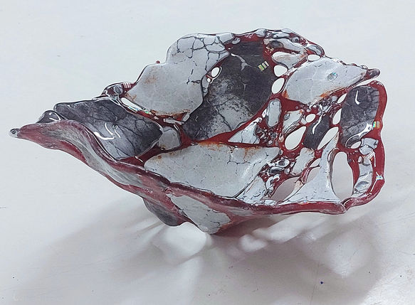 This holey vessel began as pure powders, which, melting in the kiln, bled like open veins into one another—fusing the pieces into a unified whole while simultaneously carving out their boundaries as distinct entities.