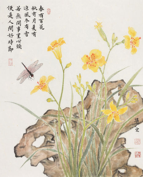The plant in this painting is the daylily, also known in Chinese culture as the forget-me-not plant, which means to forget one's troubles. The artwork uses a combination of traditional Chinese literati paintings in the form of poetry, calligraphy, painting, and sealing. The poem reminds people to learn to cherish beautiful things such as flowers in spring, cool breeze in summer, bright moon in autumn, and snow in winter, and that the best time of the year is when one is free from worries.