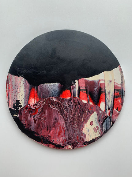 ‘Ancestors II’ represents ancestry and human survival at a very basic level. The canvas is round, chosen to show that survival responses come back and never go away. A suggestion of animal teeth and insinuations of blood express the aggression that fighting for survival can sometimes require.
