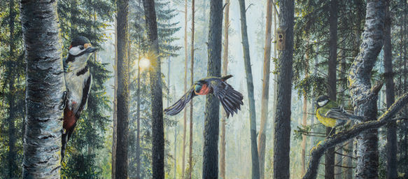 As Covid-19 kept the world on pause, social distancing became the new normal. In this piece you will find classic Swedish birds like the great spotted woodpecker and the great tit, both with their face masks close by, when suddenly a bullfinch comes flying a bit too close surprising them.