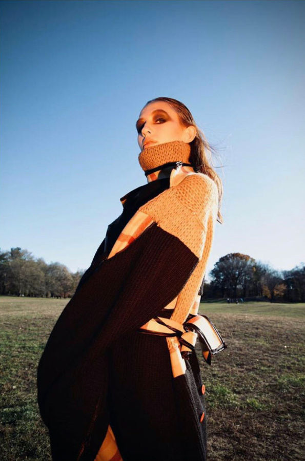 Ice sherbet multicolor chunky asymmetrical sweater with multicolor belted jacquard knit pants. The looks reflected the inner worlds of myself during the pandemic period, conflicting between frustrating and expecting.