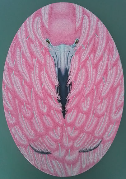 The flamingo is resting its head on its back between the feathers, but also being on guard at the same time. The oval shape of the canvas creates a balance with the shape of the flamingo.