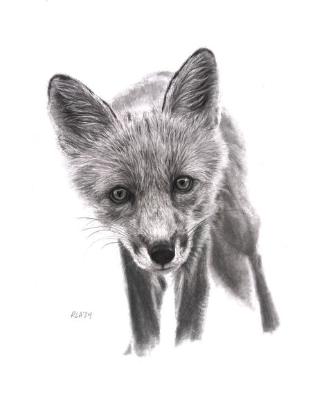 This young fox seems caught mid-thought, as if unsure whether to approach or flee. I was fascinated by that hesitation, by the energy of a creature still figuring out where it belongs. Through delicate graphite work, I tried to honor that moment of suspended decision—a portrait of curiosity as instinct in transition.