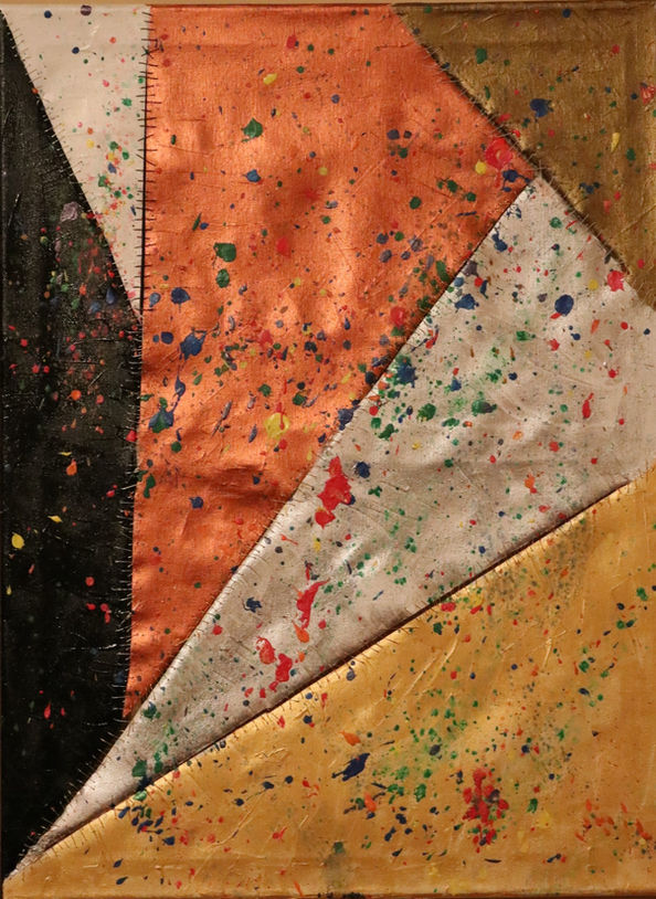While in her teens Samantha briefly studied under the watercolor artist, Helen Veatch, while painting her first wall mural in acrylic at the age of thirteen. She experimented with her first unique work in her late teens and knew she had found her niche. This piece is 1010. This was the first of her style within abstract expressionism. It's a self-described whimsical mix of abstract chunks of canvas stuck together with expressions in hand-stitched purpose and the meaning is left to the individual viewer.
