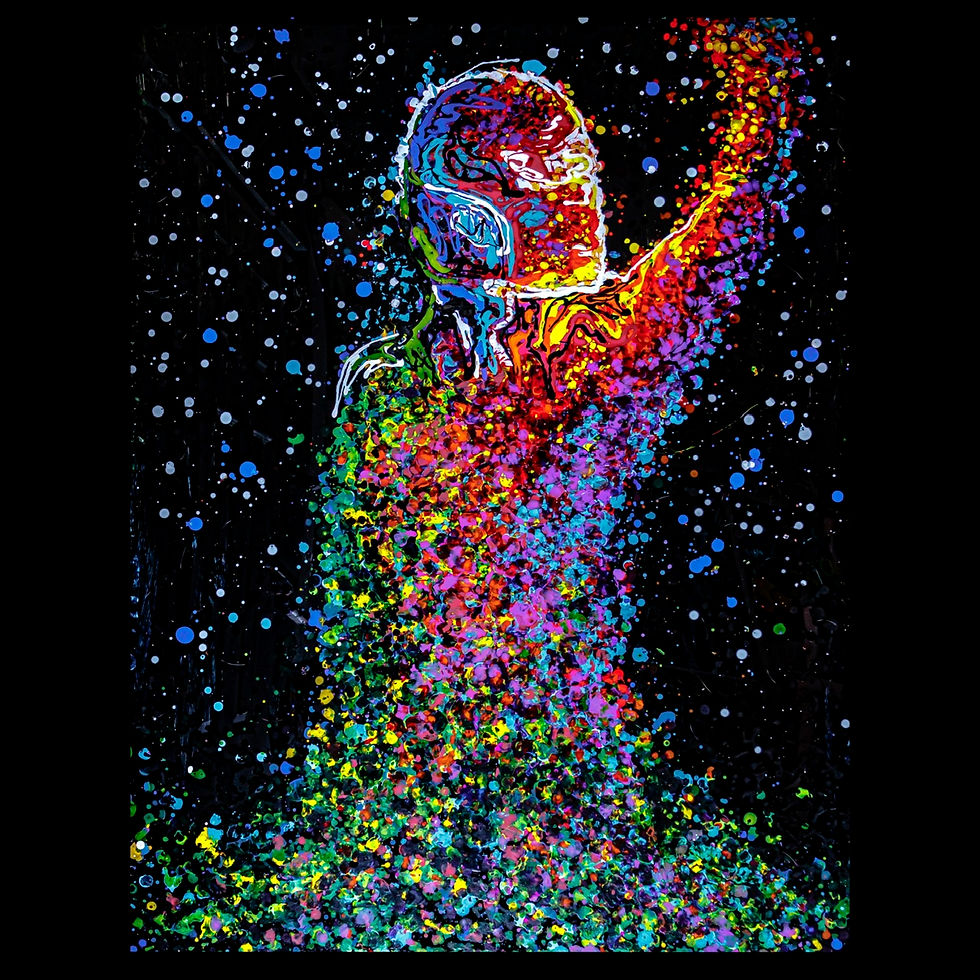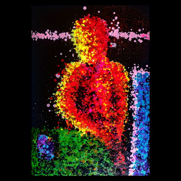 Then, I throw a few random dots on an acrylic sheet. From that random splattering, a body always emerges to me, clear as day in my mind’s eye. The rest is just further articulating and bringing to life the figure I already see via spectral waves of droplets off the ends of pipettes.